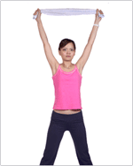 2. 將毛巾捲成條狀,雙手握住毛巾兩端並於吸氣時高舉過頭(如圖一)